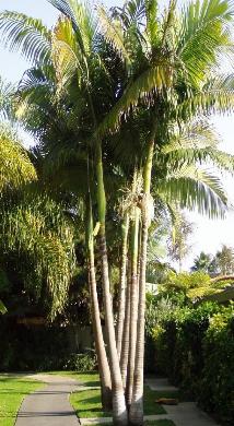 | Alexander Palm Ptychosperma elegans The picturesque alexander palm is a larger palm that can be used in smaller spaces because of its sleek, elegant form. The alexander has a "head" that's a more moderate-size scale than some larger palms, allowing it to be planted in fairly narrow spaces. It's sometimes called "Solitaire Palm" because it's solitary in nature (meaning it only grows one trunk). But this pretty palm shows off to best advantage with multiple trunk specimens for bigger landscaping impact. Triple-trunk alexander palm by two-story house Occasionally confused with the alexandra palm (Archontophoenix alexandrae) - a relative of the piccabeen palm - the alexander is a more commonly used landscape palm. Self-cleaning palms like the alexander are highly prized for ease of care since aged fronds fall off by themselves. The fruit produced by a mature palm is a good food source for birds. Plant specs Alexander palms grow to an ultimate height of 20 to 25 feet, and prefer full to part sun locations though they'll grow just fine in part shade. They do best in warmer areas - Zones 10A and 10B - especially when they're placed in a spot that's protected from drying or cold winds. This palm is a moderate grower and can even be grown indoors where there's enough height and light to let it thrive. Alexanders are moderately drought-tolerant once they're well-established. Plant care Use organic peat moss or top soil as a soil amendment when planting an alexander. Fertilize three times a year - in spring, summer, and autumn - to keep the fronds full and deep green. Since it's self-cleaning, you won't have to worry about removing dead fronds when the palm is tall. Water on a regular basis. Plant specs Because of its slender gray-ringed trunk and the moderate scale of the head, an alexander can be planted in a small yard - and in close proximity to the house as an architectural accent. Plant 5 or 6 feet or more from the house, positioning multi-trunk palms in a way that makes sense for future growth. Avoid placements where the fronds touch walls. You can plant these palms as close as 3 feet from a fence or short wall provided the head of the palm clears the top of the structure. If you're planting a row of alexanders, place them 5 or 6 feet apart. Alexander palms are fine in large containers, and can be used as striking interiorscape specimens if they've been acclimated to an indoor space. Landscape uses for alexander palm architectural accent for a tall structure, like a 2-story house anchor for a garden bed specimen for the center of a circular driveway backdrop planting for smaller palms and cycads stand-alone specimen in the yard large container plant for the pool or patio lining a driveway or property border (if protected from wind) |